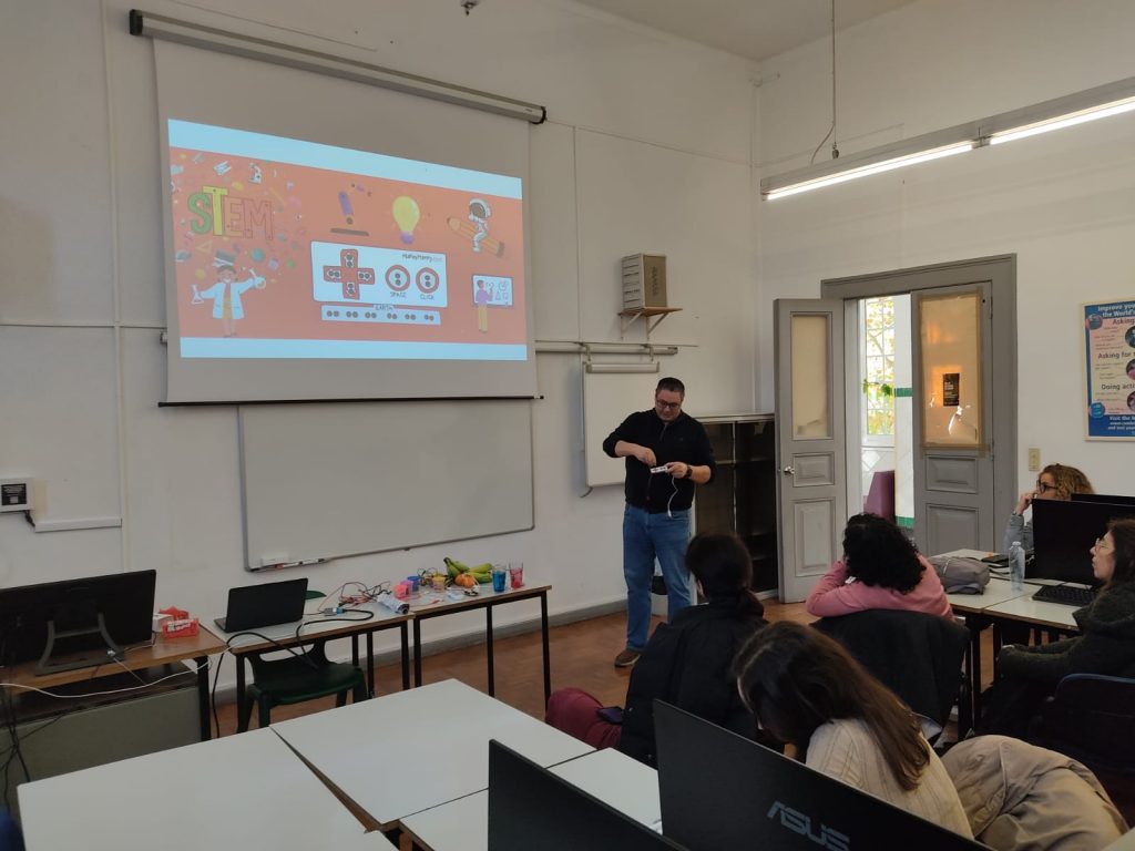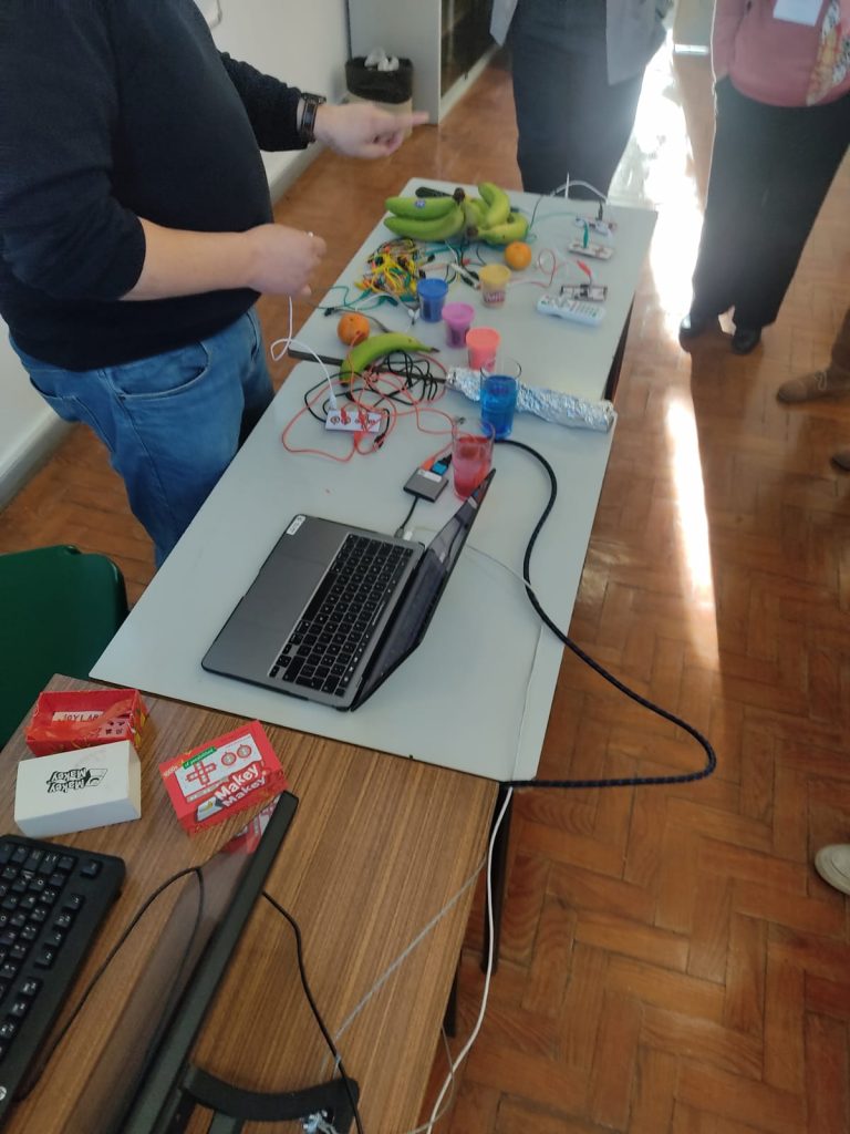 Durante cerca de duas horas, os participantes tiveram a possibilidade de refletir sobre a importância das STEAM e do trabalho de projeto nos primeiros anos de escolaridade e experimentar microscópios digitais e os Makey Makey, pensando em atividades que poderão ser realizadas com estes recursos nos primeiros anos de escolaridade.